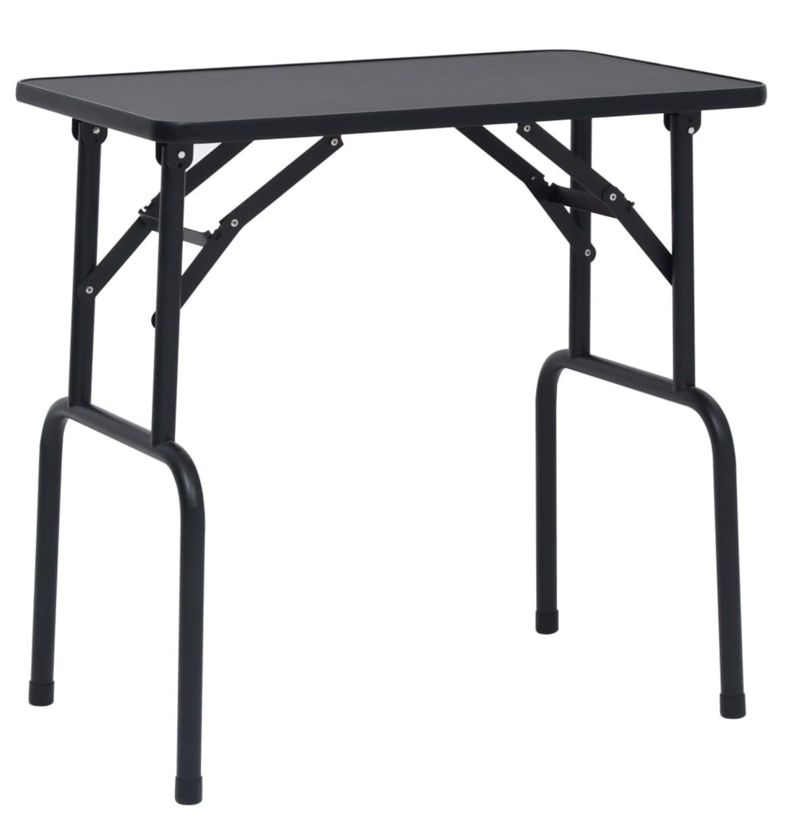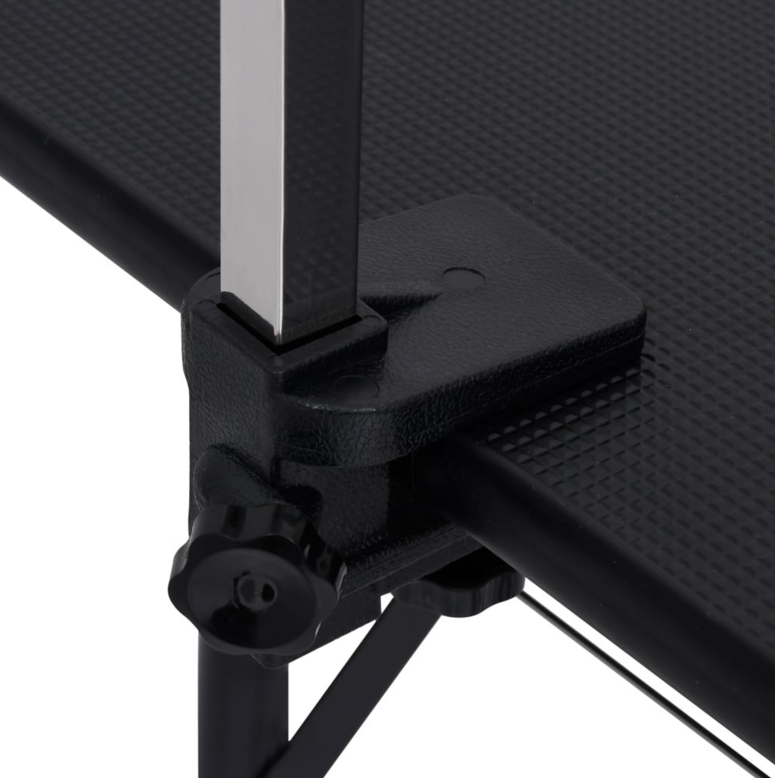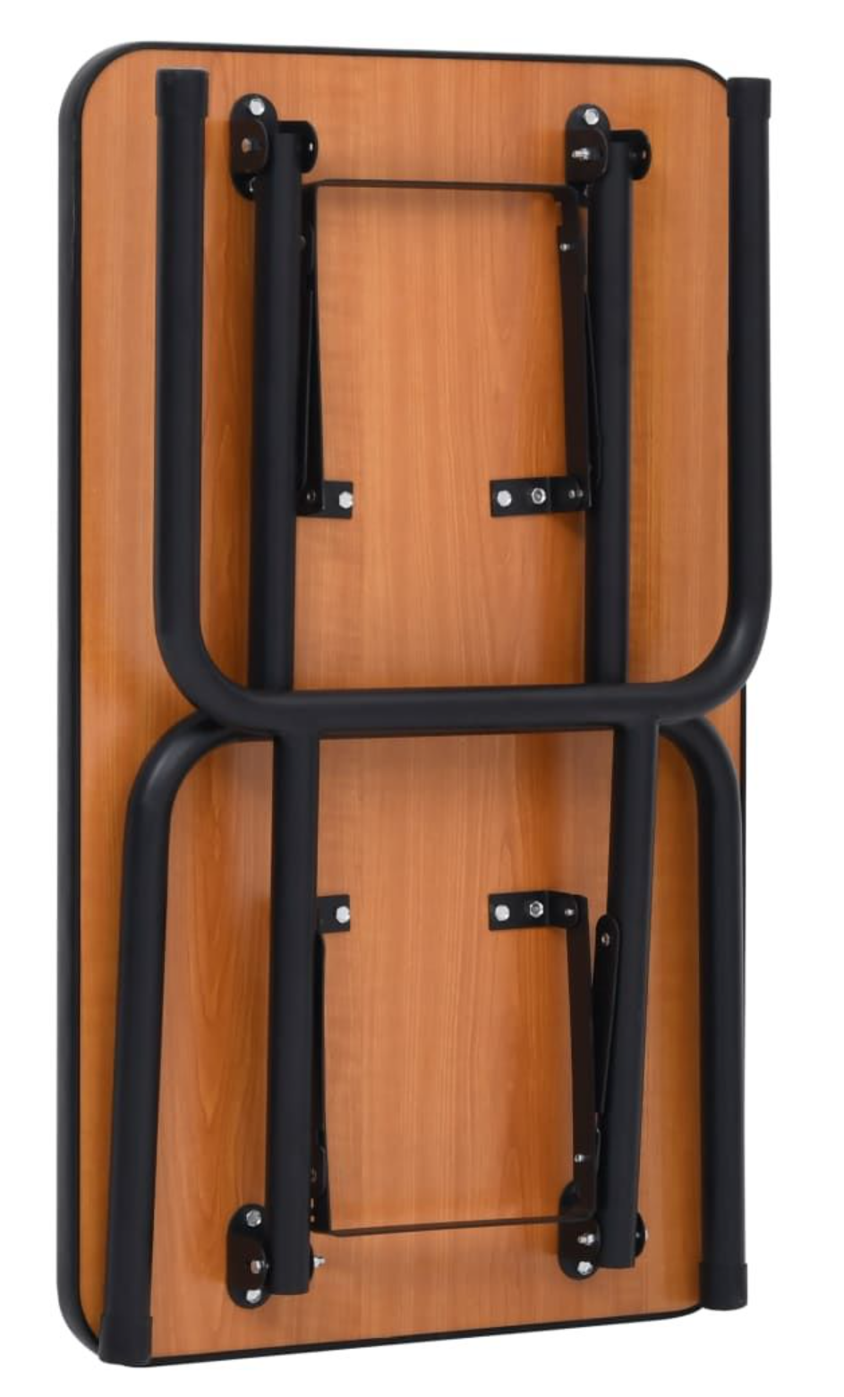 Structura mesei este susținută de picioare rotunde și robuste din metal negru, concepute pentru sarcini intense. Capacele din cauciuc montate la baza picioarelor previn alunecarea și protejează podeaua de eventuale zgârieturi.