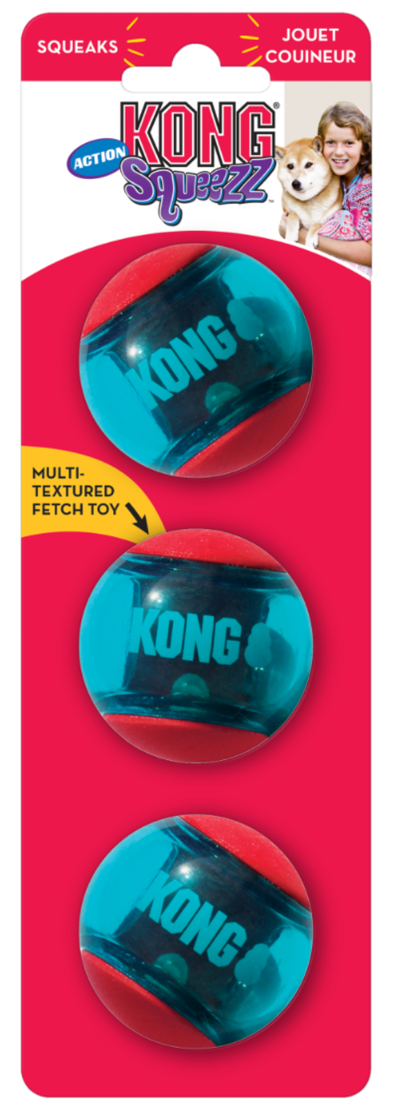 Mingile de acțiune KONG Squeezz în pachet de 3 sunt create special pentru câinii care adoră jocurile dinamice și interactive. Realizate din cauciuc flexibil și rezistent, aceste mingi au o formă concepută pentru a sări în mod imprevizibil, menținând câinele implicat și activ în timpul jocului.