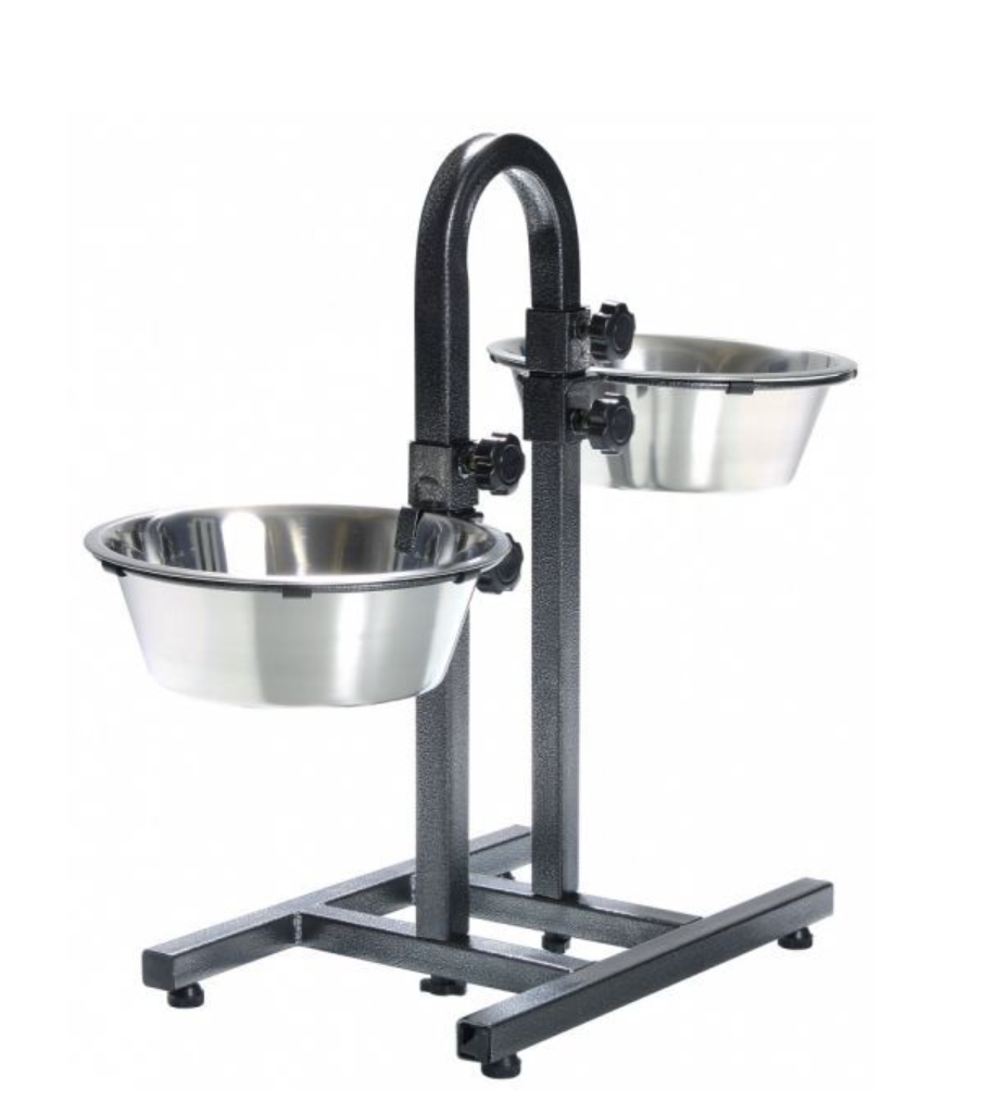 Suport de hrănire Topmast reglabil în formă de U, cu 2 boluri din oțel inoxidabil de 25 cm și capacitate 2×2,8 L. Ideal pentru ajustarea înălțimii pentru o hrănire confortabilă.
